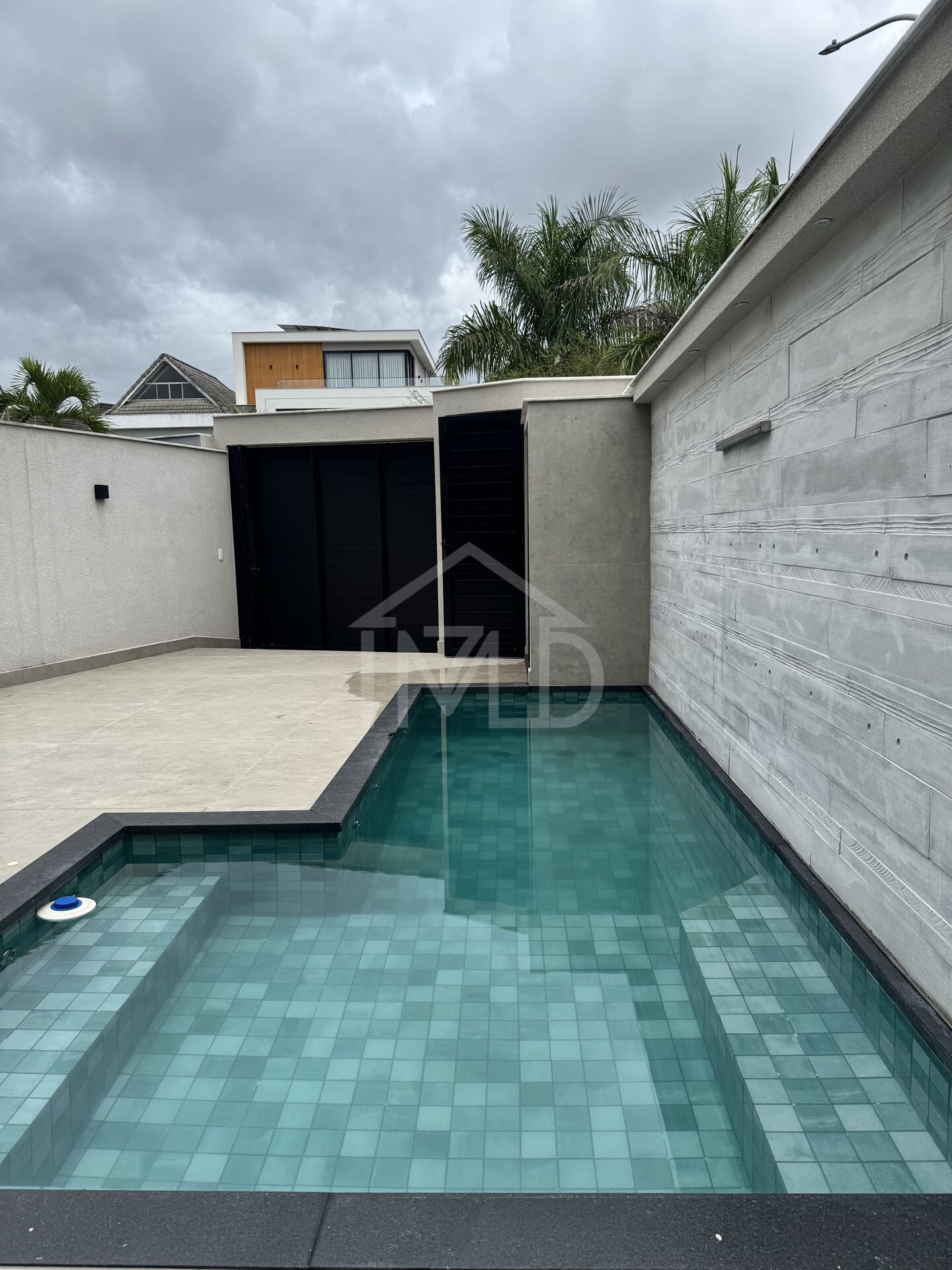 Encontra-se em um condomínio protegido por muros.