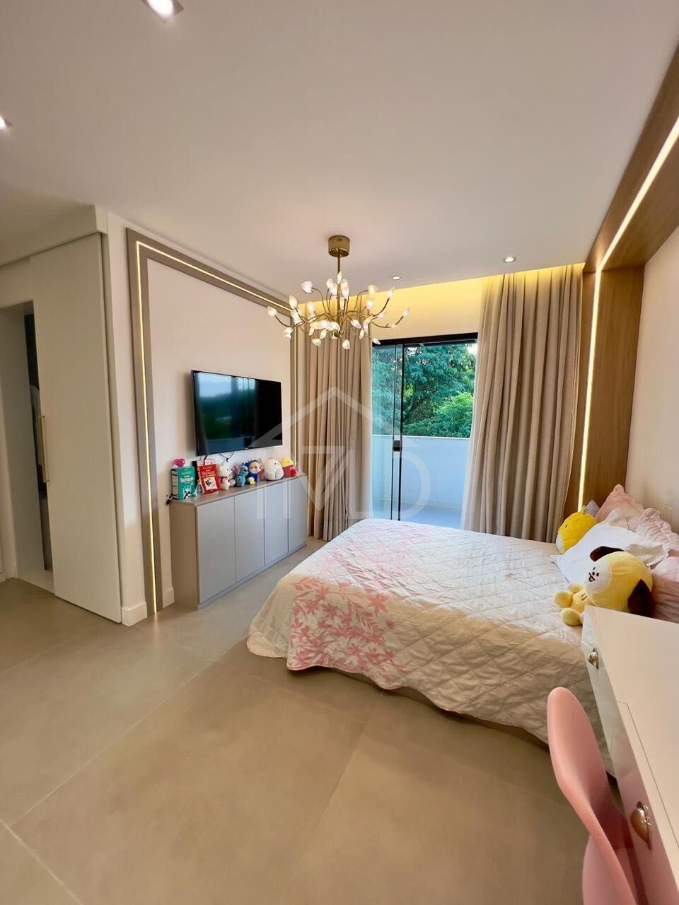 2º Pavimento: hall de distribuição para 3 suítes com piso em porcelanato, armários, varanda e climatização através ar condicionado modelo split O diferencial da suíte master fica por conta do amplo closet e salão de banho com 2 cubas.