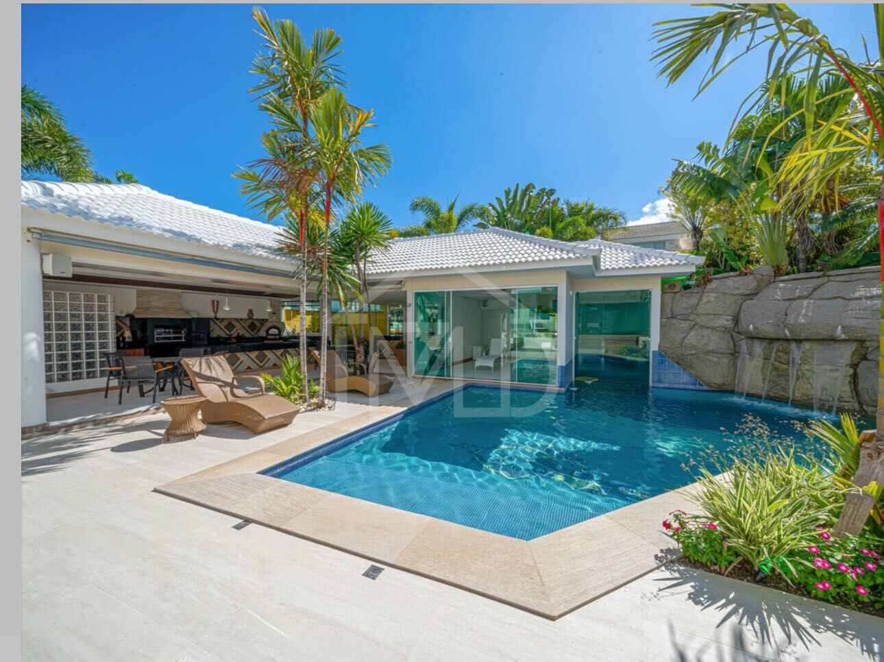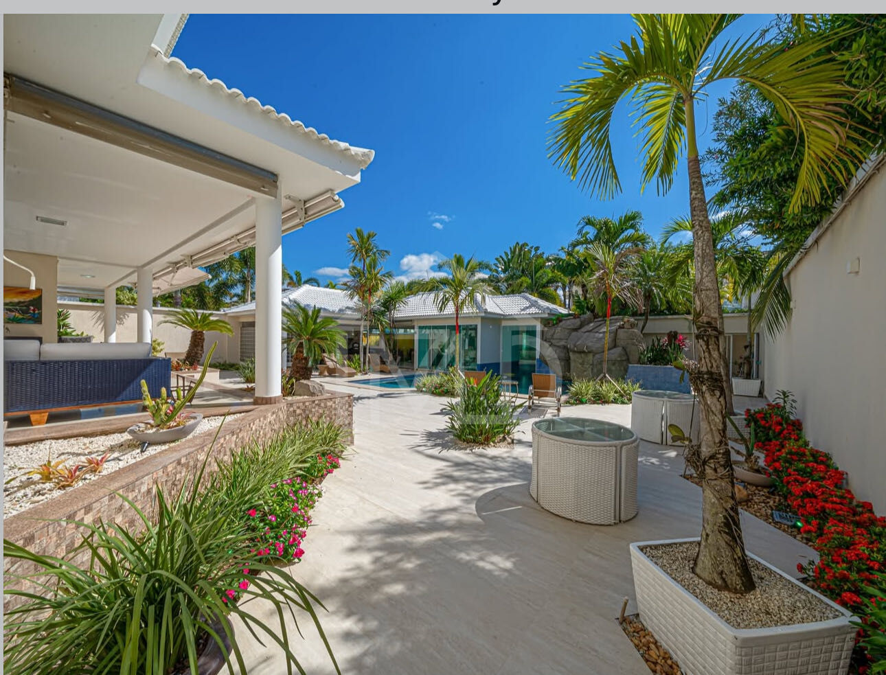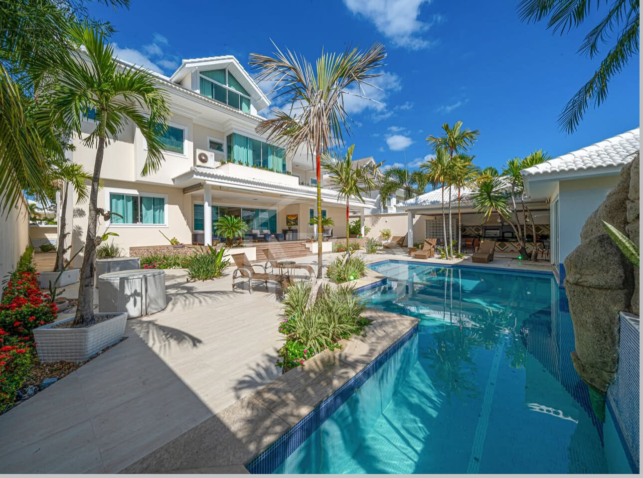 São 1000m², elevador, garagem subterrânea para 10 carros, sala multiambiente com piso em mármore, adega, 5 suítes, dependência completa e uma área de lazer impressionante.